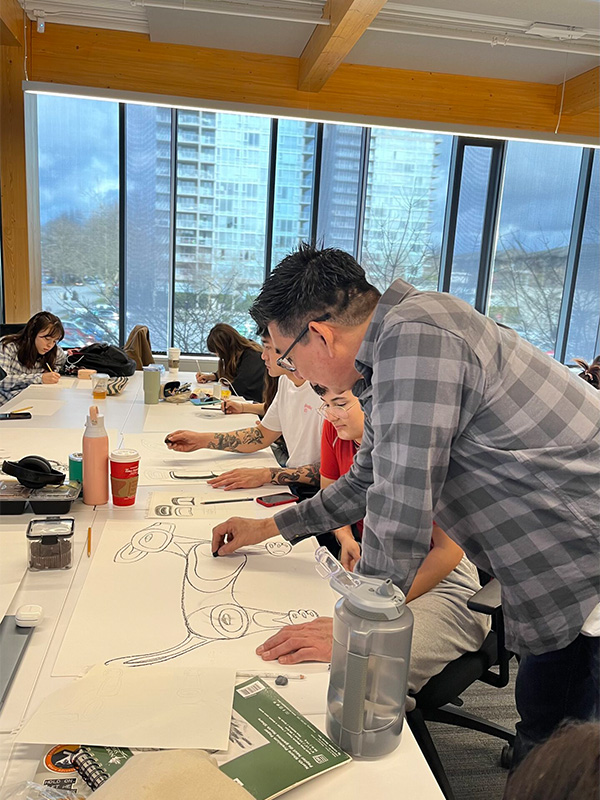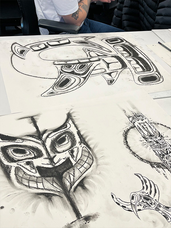 “We were fortunate that Pam Baker, our Indigenous designer in residence, was able to invite West Coast artist Klatle-bhi, to our DEPD (Product Design) History class on March 29. As the course content is predominately Eurocentric, I was interested in introducing the students to an Indigenous perspective. Klatle-bhi shared his personal story and his inspiration for his artwork while leading the students through a sketching workshop, which introduced them to Coast Salish art. The students had the opportunity to sketch their interpretation of their spirit animal.”
