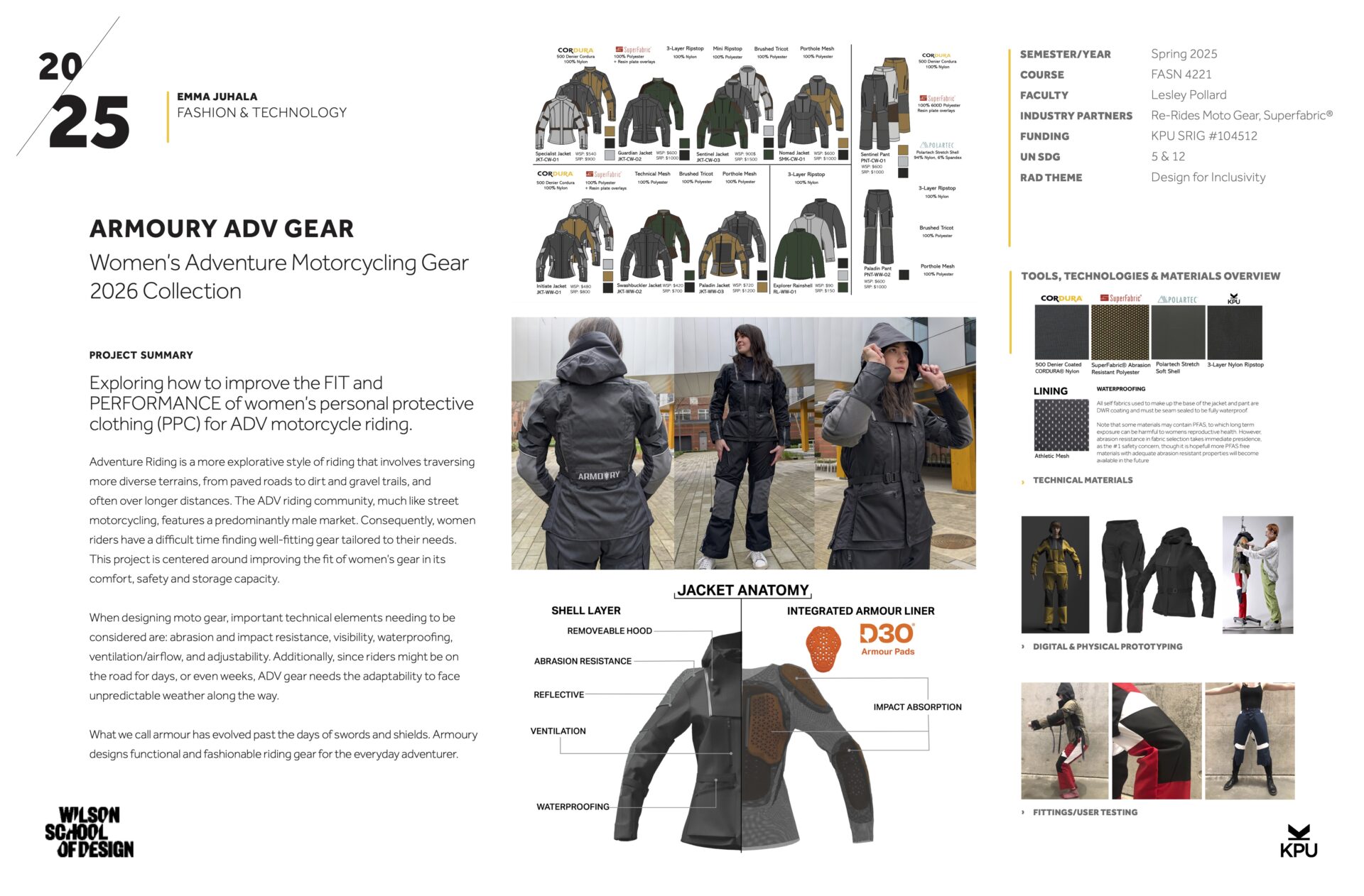 Adventure Riding is a style of riding taking place on a wide range of on and off-road terrains that, like street motorcycling, features a predominantly male market. Consequently, women riders have a difficult time finding well-fitting gear tailored to their needs. This project is centered around improving the fit of women’s ADV motorcycling gear in its comfort, safety and storage capacity.