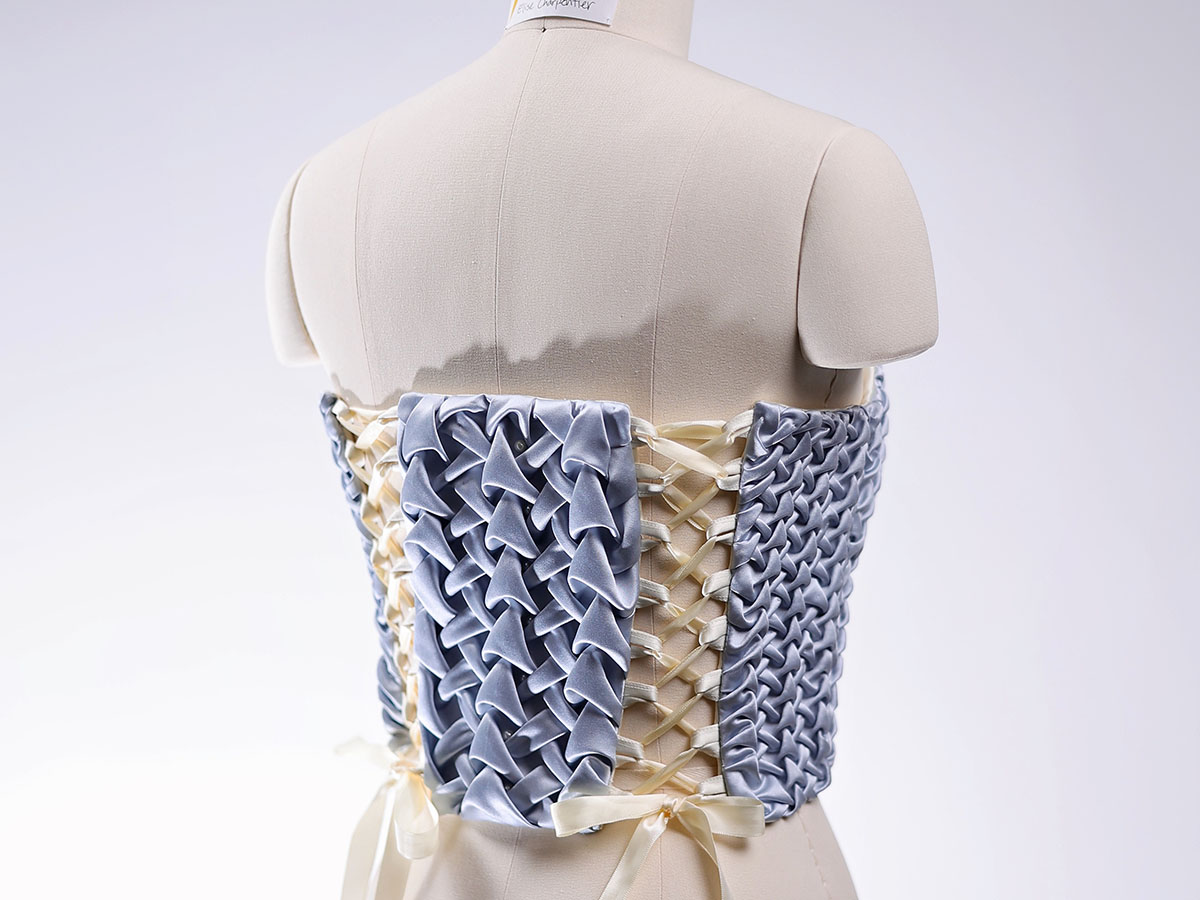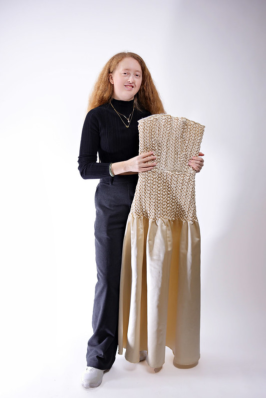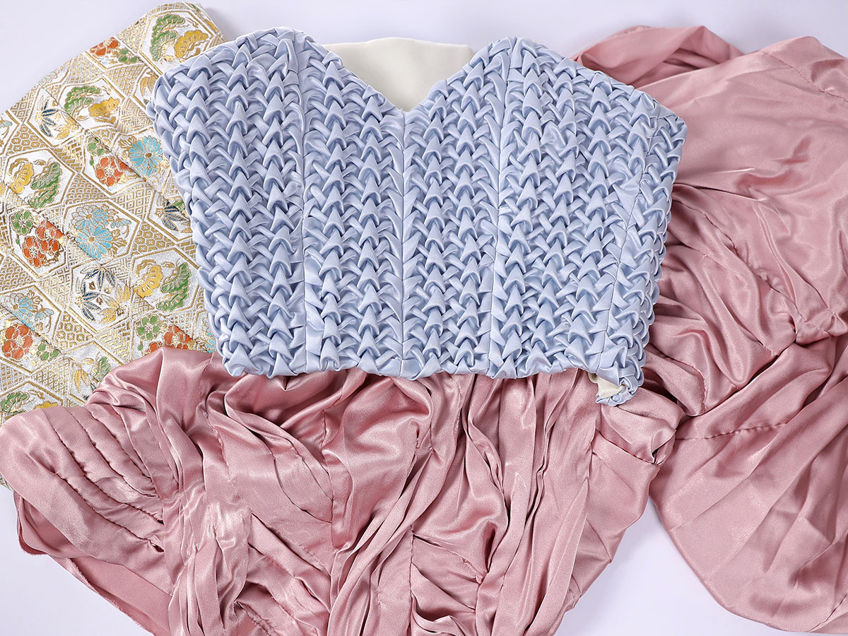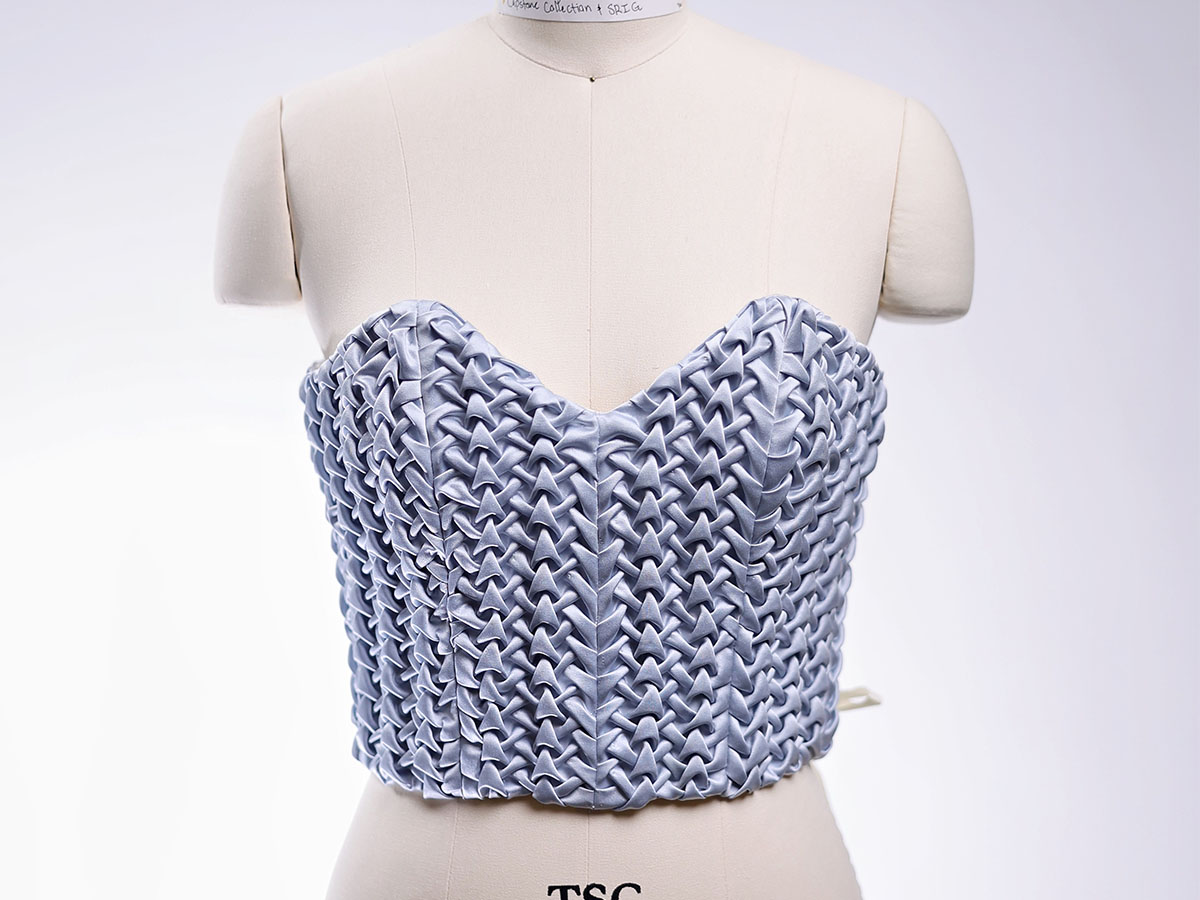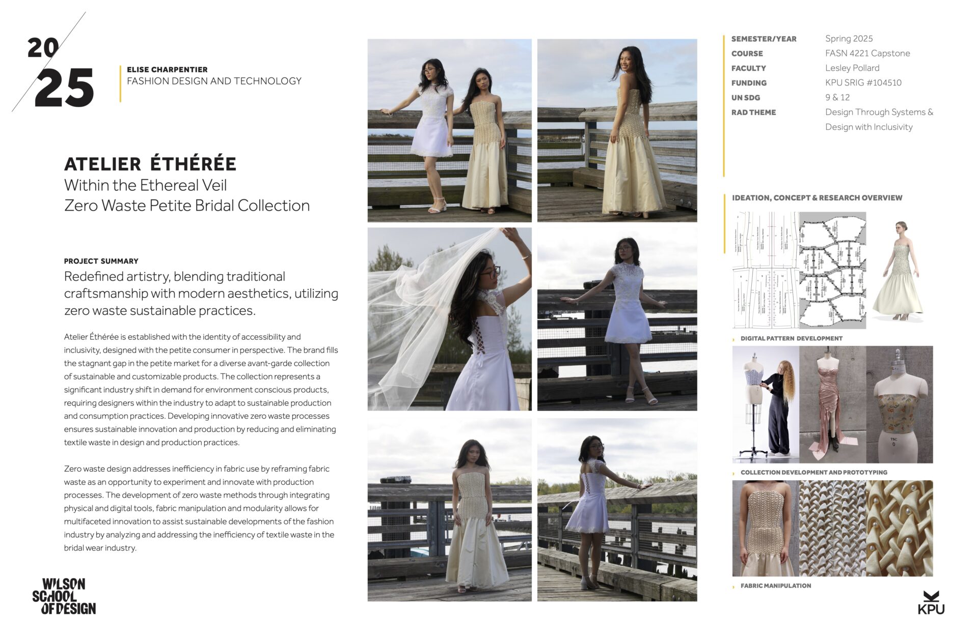 The project redefines artistry, blending traditional craftsmanship with modern aesthetics, while utilizing zero waste sustainable practices. The collection fills the stagnant gap in the petite market for a diverse avant-garde collection of sustainable and customizable products. The collection utilizes fabric manipulation and zero waste patterning to reduce fabric waste while also being designed with the petite consumer in perspective, designing for a petite bride’s proportions. The development of zero waste methods through integrating physical and digital tools, fabric manipulation and modularity allows for innovation to assist sustainable developments by analyzing and addressing the inefficiency of textile waste in the bridal wear industry.
