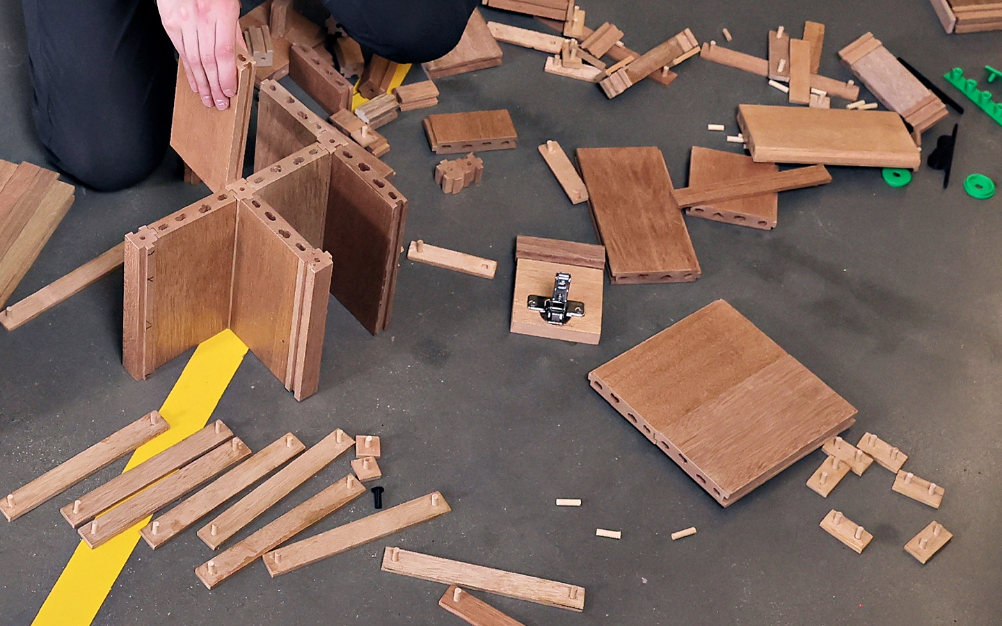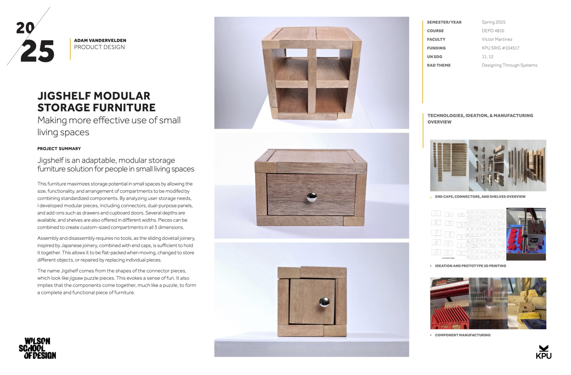As urban housing becomes denser, many people struggle to find adaptable storage solutions that suit smaller living environments. Traditional furniture often lacks the flexibility to evolve with changing user needs, while modular options can be difficult to assemble, requiring tools, or are aesthetically limited. It also lacks sustainability in that individual parts are difficult or impossible to replace, and is typically discarded if it doesn’t fit. Finally, traditional furniture has ethical concerns relating to Volatile Organic Compounds (VOCs) released from the materials used, to which the end users and factory workers are often exposed. This project addressed the need for sustainable, customizable, and user-friendly furniture systems for small space dwellers.